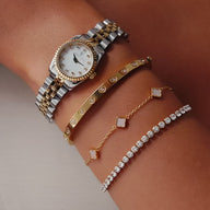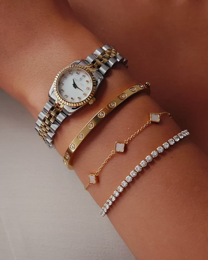 Meet your dream wrist stack – a luxurious crystal heart bangle, cubic zirconia tennis bracelet, shimmering pearl clover piece and our bestselling two-tone Essence Watch. With a mix of metals and touches of sparkle, each piece pairs seamlessly together as your everyday look. Perfect for gifting to that special someone or keeping all to yourself...