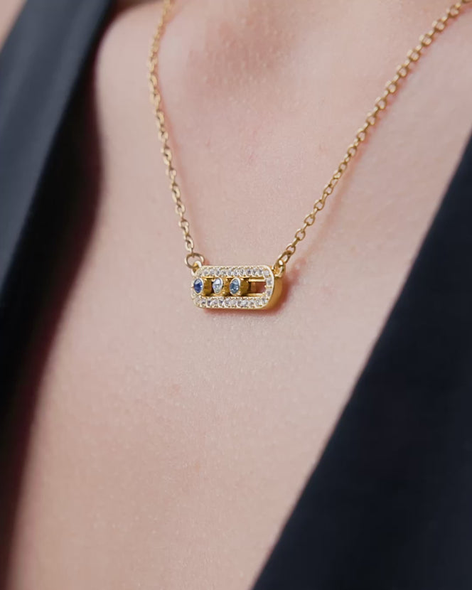Featuring three dainty kinetic crystals that glide smoothly with your movement, this glistening fidget necklace brings calm and comfort when you need it most. Finished in 18k gold plating with your choice of three birthstone-coloured pavé stones, it’s the touch of everyday luxury you’ve been waiting for – pair it with the matching bracelet to complete the look.
