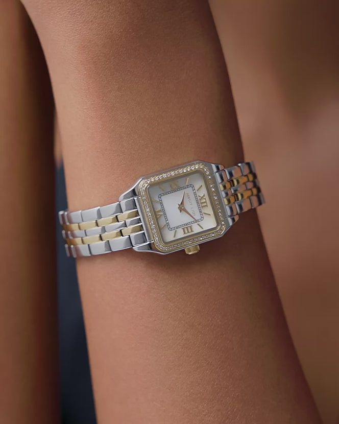Featuring a sleek square face and a luminous mother-of-pearl dial, we've added a pavé-encrusted edge that catches the light just right. The perfect mix of gold and silver — style it solo or stack with our dainty bangles for an elevated look.