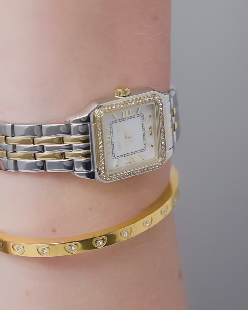 Featuring a retro-inspired square face, luminous mother-of-pearl and a pavé encrusted dial, the Essence Watch instantly elevates any look. Paired with our signature Crystal Heart Bangle, finished in 18k gold plating and crystal accents, this duo is the ultimate stacking set.