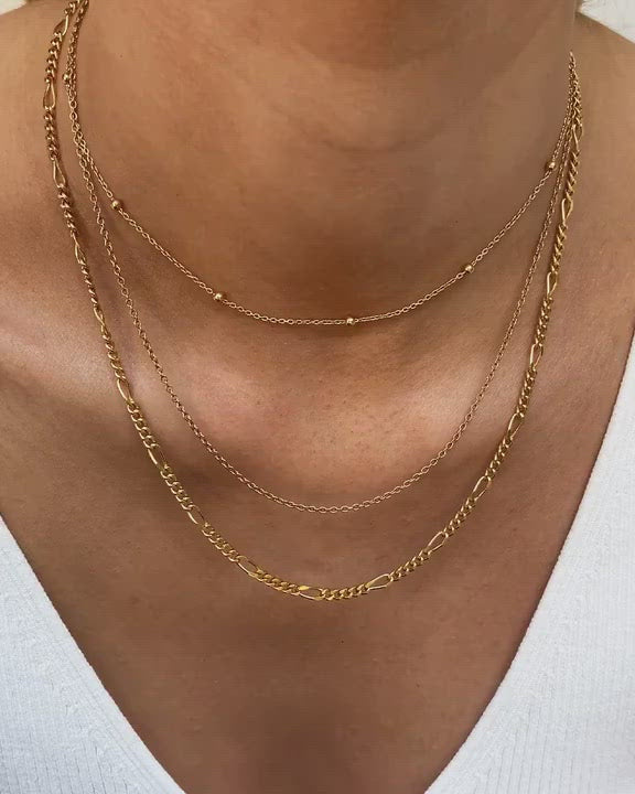 We've done the styling for you with our beautiful collection of layered sets. Our most wanted pieces have been curated into effortlessly stylish combinations to create the must-have layered luxe look that will complete every outfit. Here we've paired our elegant Fine and Sphere Chains with our beautiful Small Chain Figaro necklace to create an elegant, timeless set that you'll wear again and again. Pair with any of our stunning pendants for a unique finish.