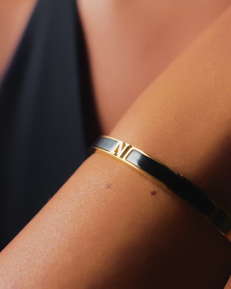 A daintier take on your favorite Icon Bangle. Featuring statement black enamel, this designer-inspired style is plated in luxurious 18k gold. Add your own initial – or someone special’s – to create the perfect personalized piece. Designed to stack, style solo, or gift.