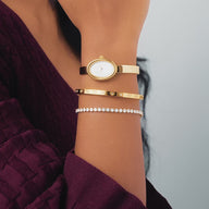 Add a touch of sparkle to your wrist with this effortless stack. Featuring our vintage-inspired Monroe Bangle Watch with a shimmering pearl oval dial, our crystal tennis bracelet and heart bangle, each piece catches the light just right. Designed to be worn all day, every day, it's the perfect set to gift or keep all to yourself.