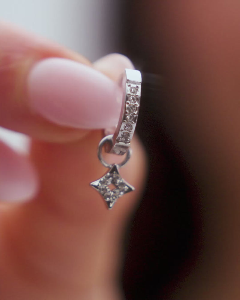 Feel like the star you are with these clear cubic zirconia gem-studded star charm huggie earrings, Platinum plated stainless steel. Part of the To The Moon And Back Collection, wear everyday with any dress code for subtle shine. Gift to a friend to show how much they mean to you.