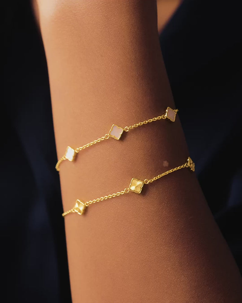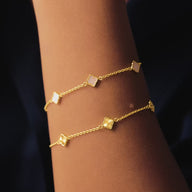 Part of our bestselling Clover Collection, this mini duo is made from luxurious sterling silver for an effortlessly elegant finish. One bracelet glistens with mother of pearl stones, while the other features a golden fluted texture – each bringing a subtle touch of luck to any look. Perfect for wearing solo, together as a set, or stacked with your favourite Abbott Lyon chains.